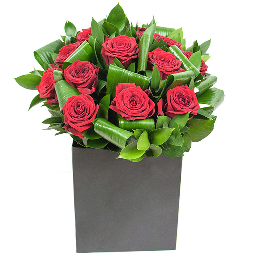 Introducing a bouquet that speaks volumes of sophistication and charm – a vibrant arrangement of red roses intermingled with aspidistra leaves and ruscus.