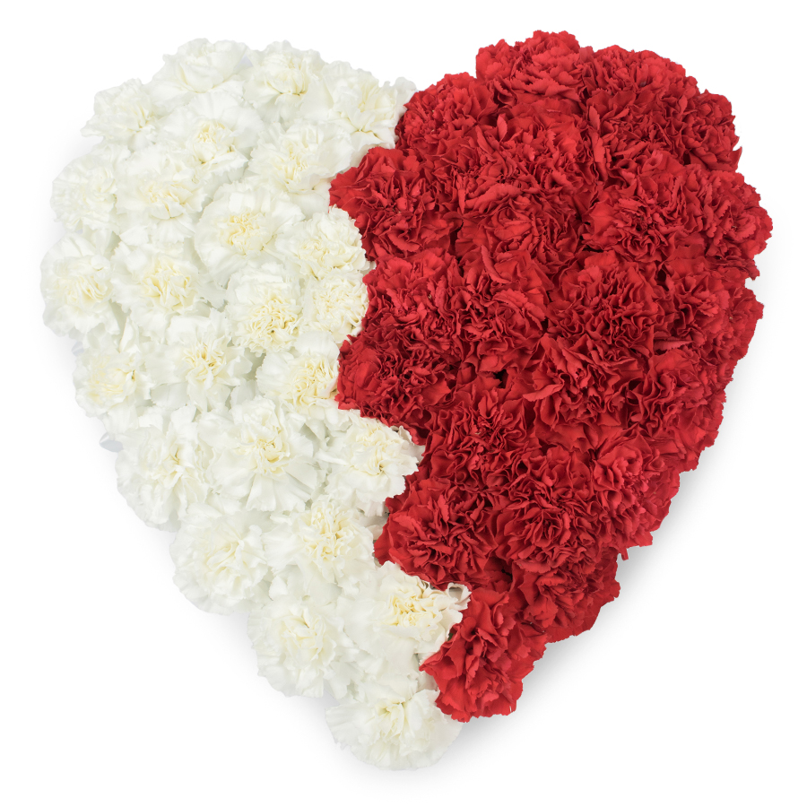 Discover the exquisite beauty of our heart-shaped arrangement, combining vibrant red and elegant white carnations. Each flower is hand-selected for premium quality and freshness, creating a stunning visual impact.